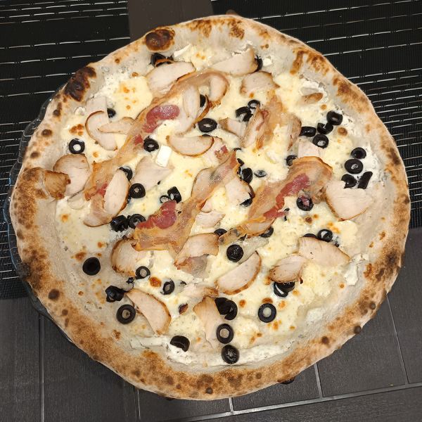 fokhagymás-tejfölös alap, grillezett csirkemellfilé, pancetta, olívabogyó, szárított paradicsom, mozzarella sajt, brie sajt