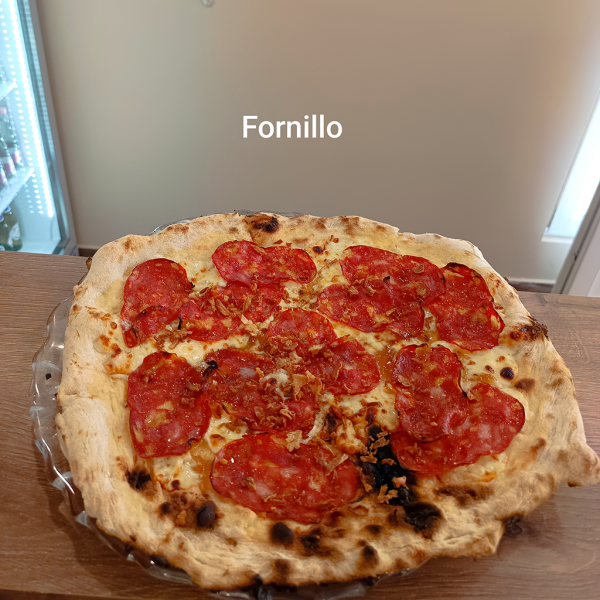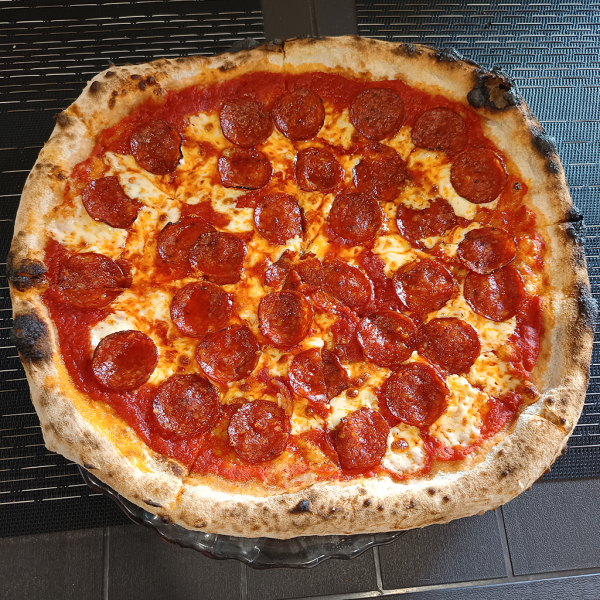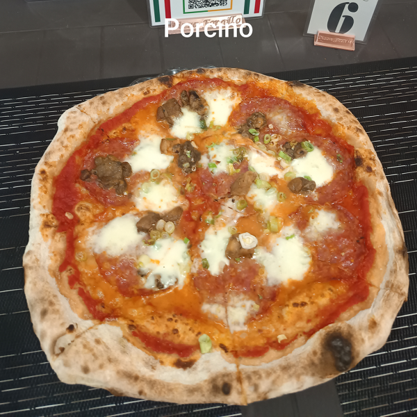 paradicsomszósz, olasz csípős szalámi, vargánya gomba, póréhagyma, mozzarella sajt