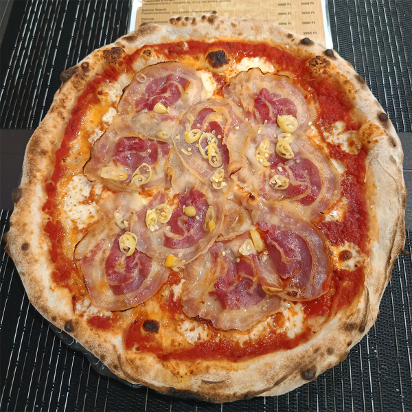 paradicsomszósz, pancetta, csípős pepperoni paprika, mozzarella sajt, ricotta
