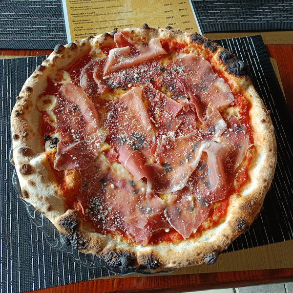 paradicsomszósz, pármai sonka, szarvasgomba, mozzarella sajt, grana padano sajt, olívaolaj