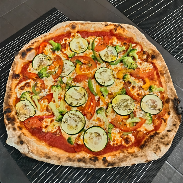 paradicsomszósz, kaliforniai paprika, cukkini, brokkoli, paradicsom, mozzarella sajt