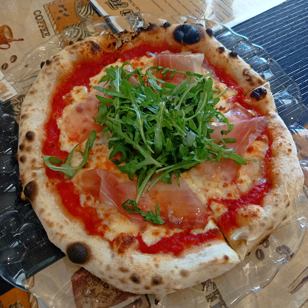 paradicsomszósz, pármai sonka, szárított paradicsom, rukkola, mozzarella sajt, grana padano sajt, olívaolaj