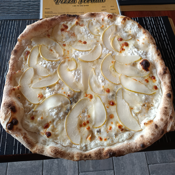 fokhagymás-tejfölös alap, körte, ricotta, gorgonzola sajt, mozzarella sajt