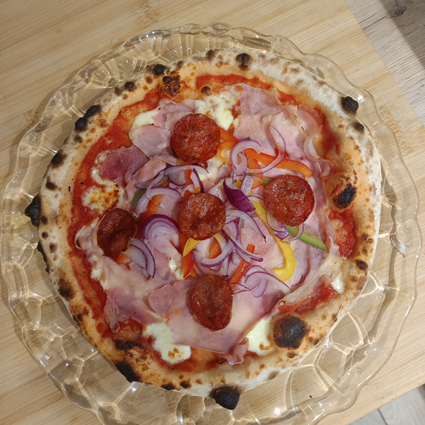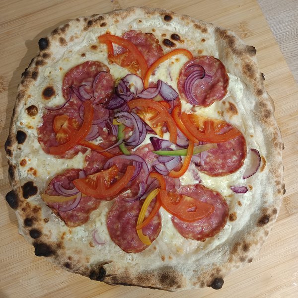 fokhagymás-tejfölös alap, nápolyi szalámi, lilahagyma, kaliforniai paprika, paradicsom, mozzarella sajt