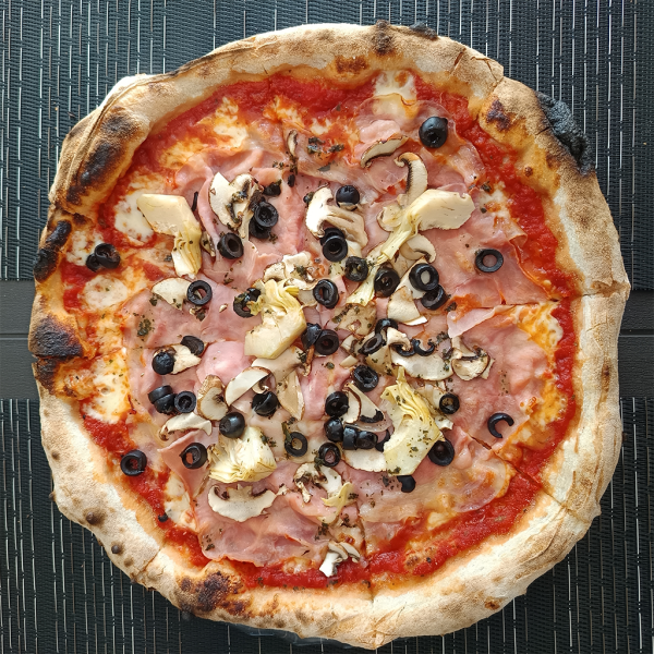 paradicsomszósz, sonka, gomba, olívabogyó, articsóka, mozzarella sajt, bazsalikomos olívaolaj
