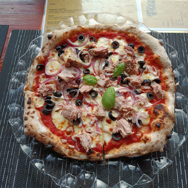 paradicsomszósz, tonhal, lilahagyma, olívabogyó, mozzarella sajt